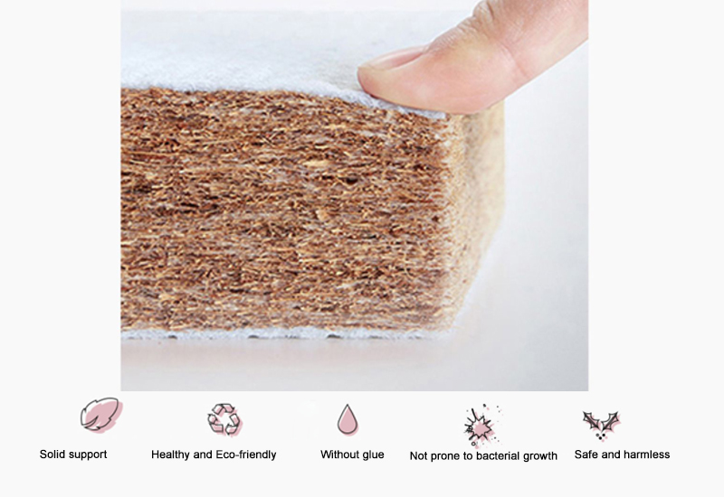 Natural coconut fiber is formed in one piece through high-temperature hot pressing. No glue is added, resulting in a denser coconut fiber layer that is less prone to collapse. It is also environmentally friendly and odorless.